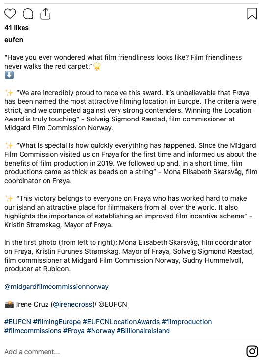🌟 “This victory belongs to everyone on Frøya who has worked hard to make our island an attractive place for filmmakers from all over the world. It also highlights the importance of establishing an improved film incentive scheme”
